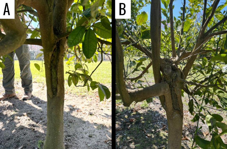 Generally, if the graft union and some portion of the scion wood survive, freeze-damaged citrus trees can recover (Figure 4). More severe damage will require a longer recovery process. The full extent of freeze damage may not become evident for several months (Lawless, 1941; Zekri et al., 2025). Damaged leaves should drop on their own in the days following a freeze event, but woody tissue dieback can continue for several weeks. Early signs of recovery will become evident during the subsequent spring flush, so any cultural practices to support recovery should be delayed until then.