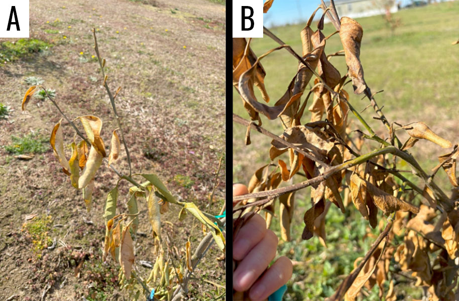 Water freezing in the cell also damages the cell wall and cell membrane, causing irreparable damage and disrupting their function (Yelenosky, 1996). This cellular damage is reflected in the water-soaked regions on leaf surfaces as they thaw. Freeze-damaged leaves can recover if the damage isn’t too severe. However, if substantial freeze damage occurs, leaves will become discolored once they thaw. Hardened-off leaves will turn brown (Figure 1A), while tender leaves will turn black. Severely damaged leaves will usually drop within a few days of thawing. If they do not drop, this can indicate the subtending wood was also severely damaged.
