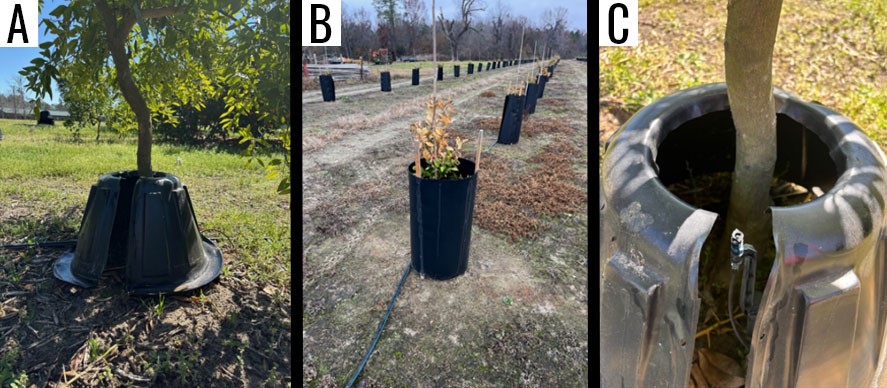 Tree covers will also cover the canopy, but they can leave the trunk and graft union exposed to freeze injury if they do not extend to the ground and are not properly anchored to the ground. The trunks become less susceptible to freeze injury as trees age, so trunk covers are most effective in younger trees. For younger trees, additional protection can be achieved by pairing a trunk wrap with irrigation by placing the emitter inside the cover (Figure 6C).