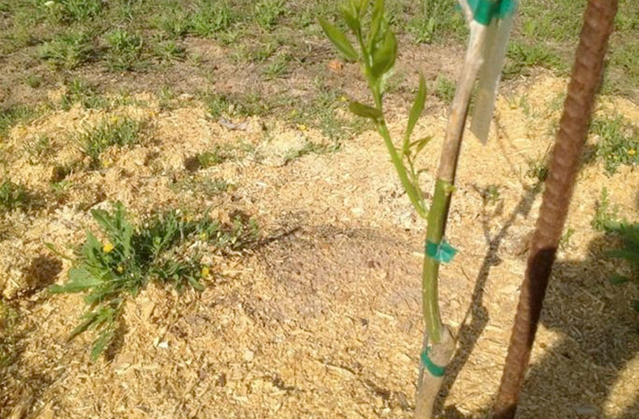 The goal of irrigation is to protect the graft union, ensuring the survival of the rootstock and a portion of the scion. To implement this, microsprinkler emitters of 90° to 180° should be placed within 12 in. of the trunk on the northwest side with the spray focused on the graft union (Figure 5).