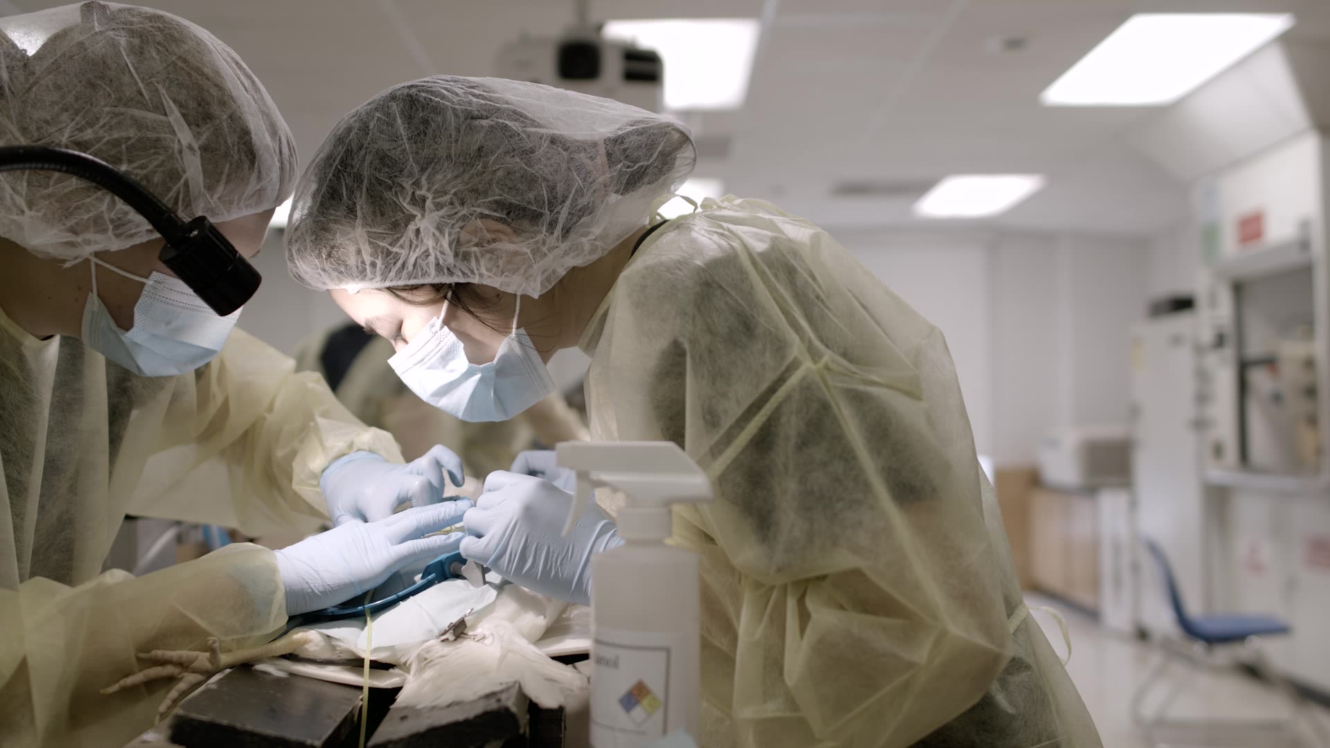 Clustered around a surgical table, students carefully perform procedures on their patients, carefully monitoring every vital sign to ensure a successful outcome.
