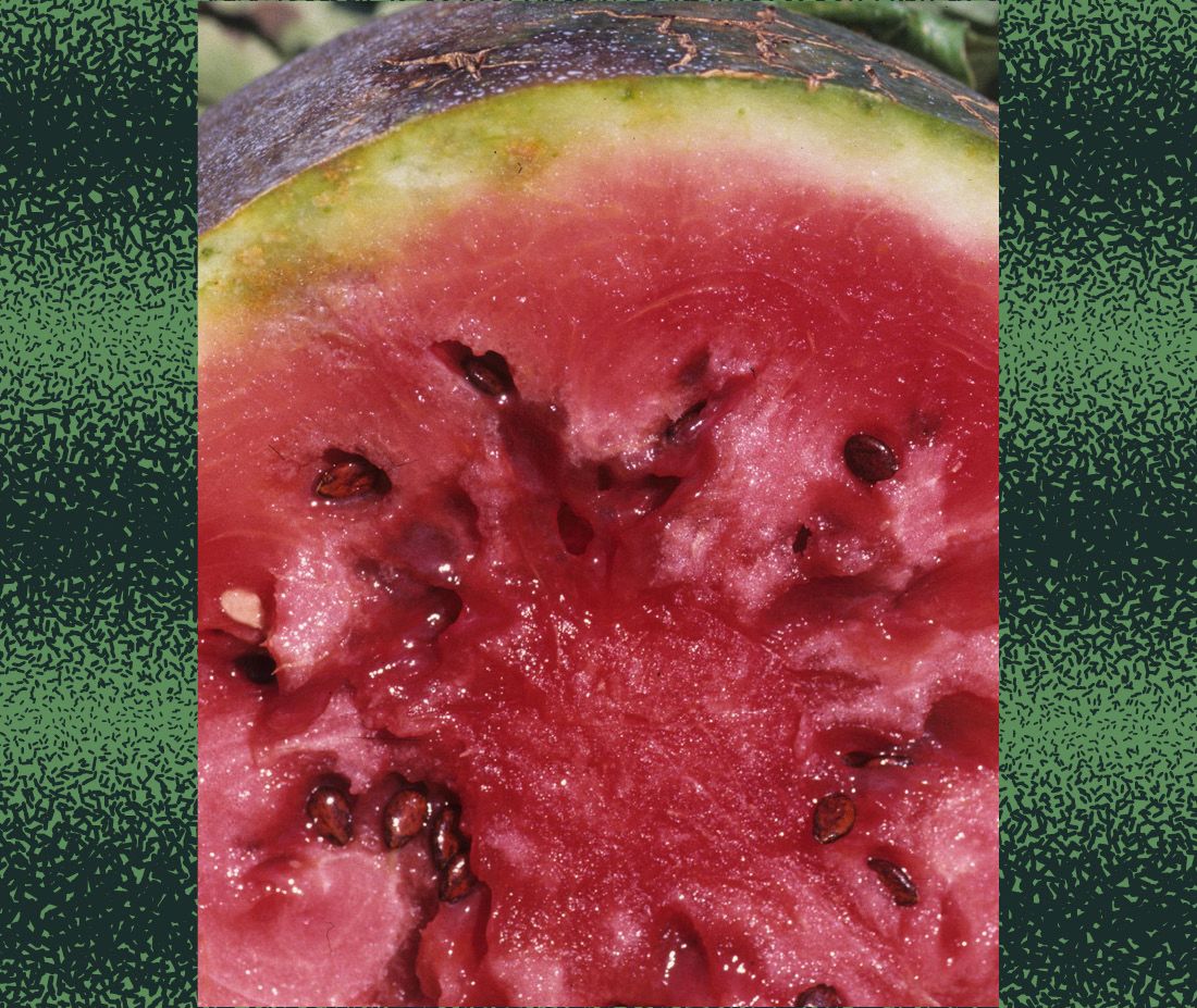 A cross section of a mature watermelon shows damage from bacterial fruit blotch (Acidovorax citrulli). (Photo by Gerald Holmes, Strawberry Center, Cal Poly San Luis Obispo, Bugwood.org)