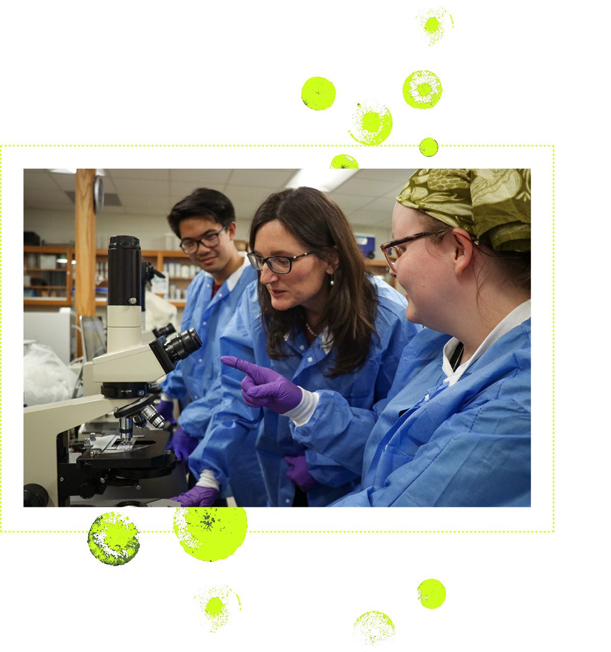 Undergraduate students Christian Ona (left) and Natalie Miller (right) examine spores with a microscope as Brewer looks on. (Photo by Katie Walker)