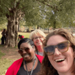 Selfie of three women outside in front of a large tree with Spanish moss.