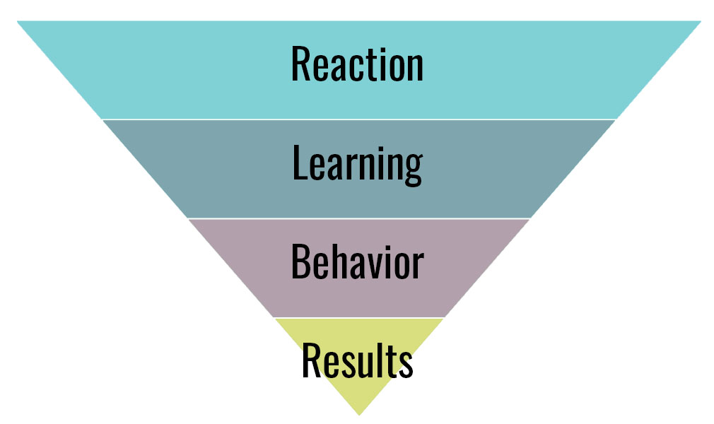 There are several evaluation frameworks available for training development. One of the more common and practically useful frameworks is the Kirkpatrick Four Levels of Training Evaluation. Figure 6 provides a visual representation of the framework with the most basic form of evaluation at the top (reaction) and the most sophisticated form of evaluation at the bottom (results).