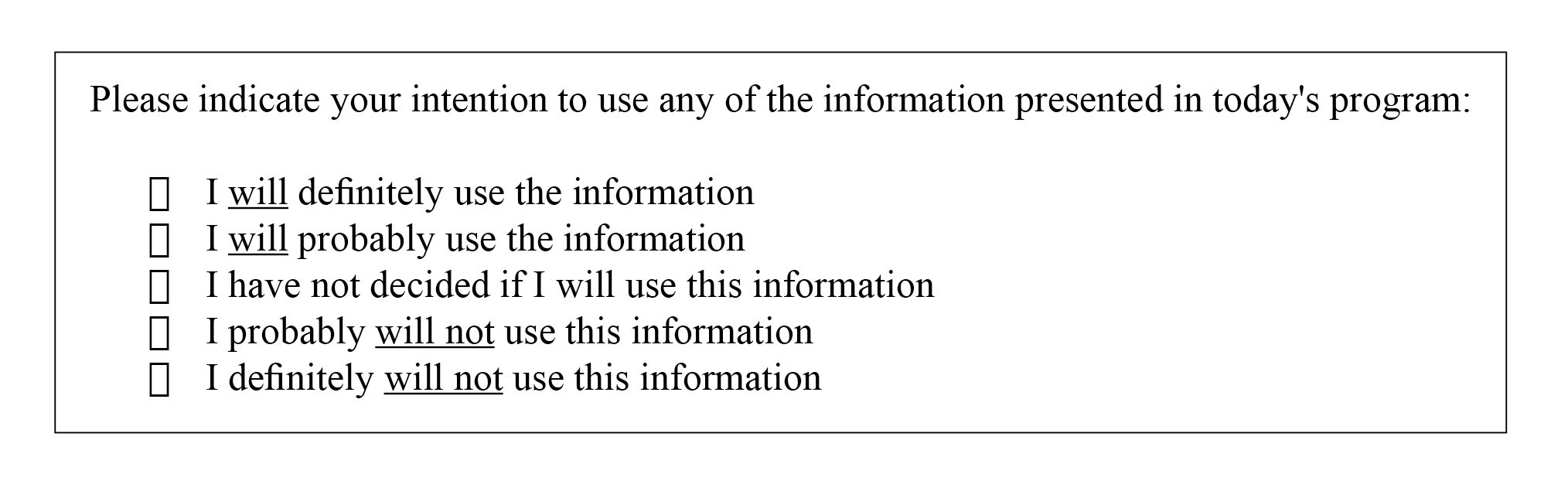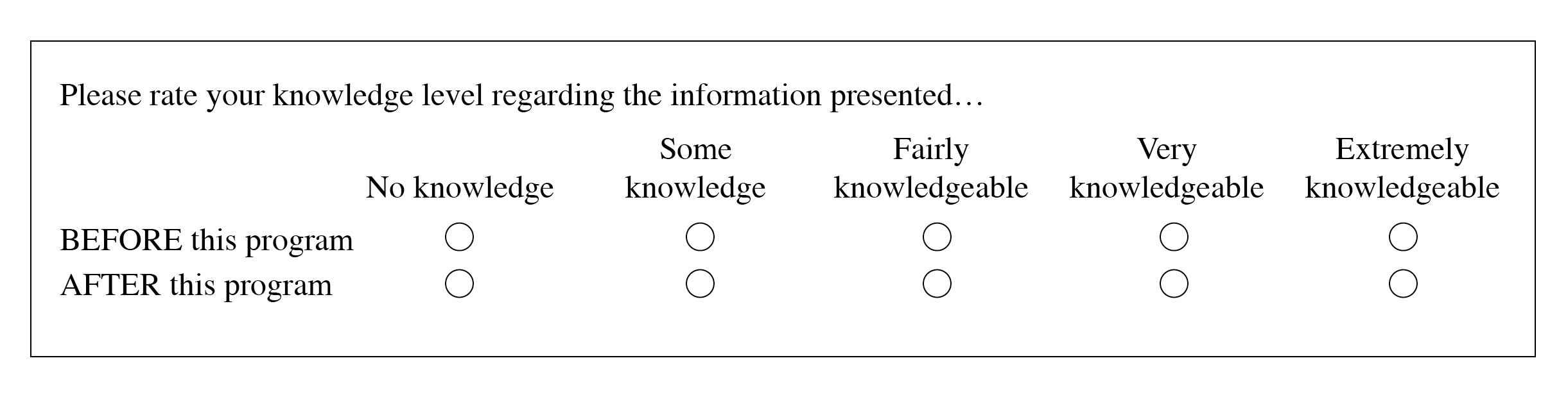 This learning-related question is likely a critical data point for you as you consider why only 5% of the cotton growers have adopted the new BMPs. You may anticipate that they had little knowledge of the topic before this program, indicating that they had not been presented with the information. You expect that as a result of participating in your training, they will experience a knowledge increase. This data point will quantitatively give you an answer.