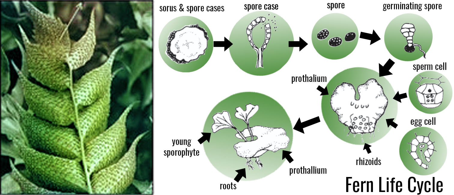Instead of growing from seed like most flowering plants, ferns come from a single spore. Spores become gametophytes, which produce male gametes and an egg structure. When fertilized, the gametophyte generates a sporophyte (the fern plant).