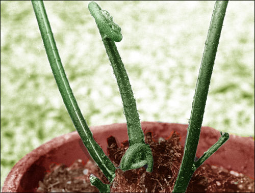 The reproduction of ferns from spores is different from other plants because there is an in-between stem (asexual stage). The individual spore is extremely small and germinates into a flat leaf-like body called a prothallium. The sexual stage comes next. Sexual organs develop on the underside of the prothallium, and fertilization occurs. Depending on the kind of fern, it may take two to six months after fertilization for the first fronds to appear.