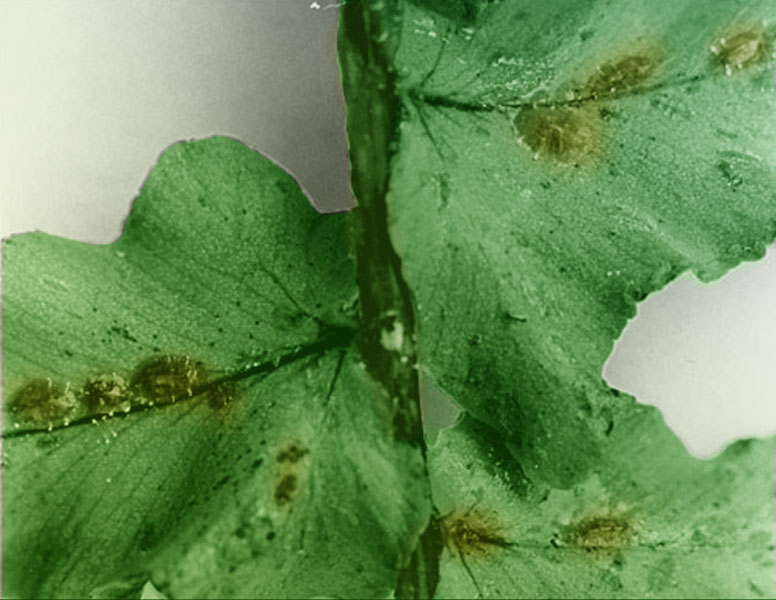 Spores are born in a spore case (sporangia or sori) on fertile fronds (sporophylls). The case contains many individual spores and is usually found on the underside of a leaf (frond) or on separate stalks. The photograph in Figure 1 shows spore cases on the underside of the leaves (pinnae) of a holly-leaf fern. Inexperienced gardeners often become concerned over these fruiting bodies and assume their plants are infested with unusual insects such as scales.