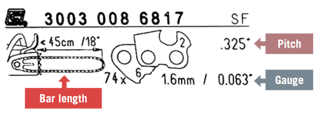 Fortunately, chainsaw manufacturers laser etch the chain pitch and gauge at the rear of the bar to make it easier to replace the chain to match your bar. Once the paint wears off the bar, it can be very difficult to read, so take a picture of it or write the information down and keep it with your manual.