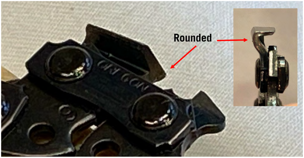 Chisel cutters have a flat top with a chiseled leading edge that creates a deeper and wider kerf (cut) than the rounded edge or the semi-chisel cutter. The side cutting plate is rounded. The chisel cuts faster than semi-chisel, but it dulls quickly in abrasive conditions. Fortunately, it is easy to hand sharpen and any shop that professionally sharpens chains can handle it.
