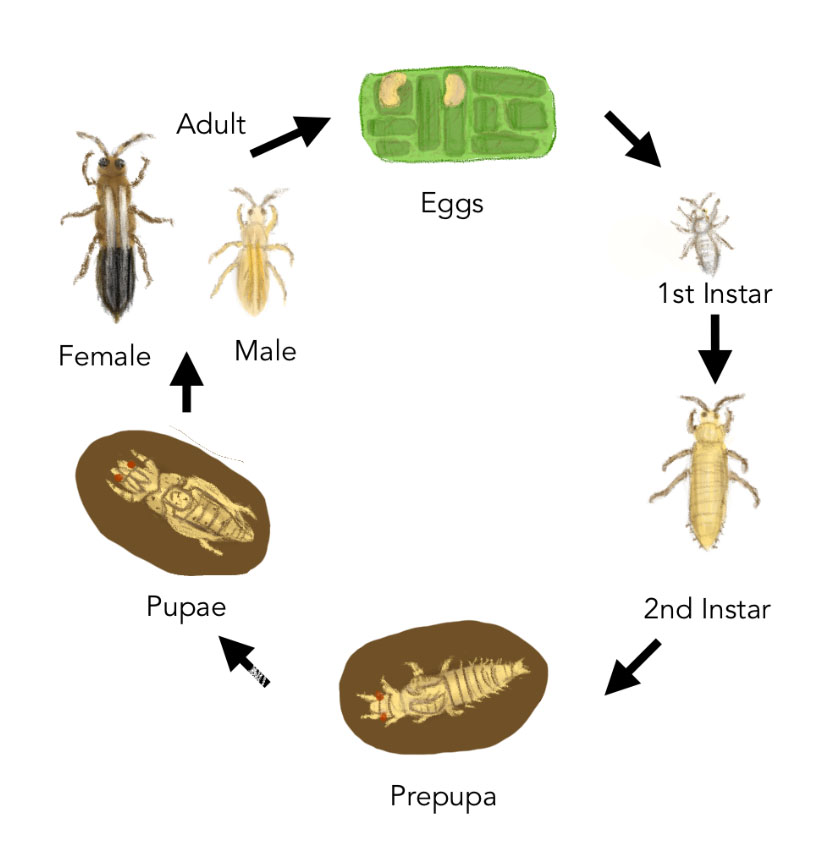 The life cycle of T. parvispinus consists of six stages: an egg, two larval stages, prepupa, pupa, and adult (Figure 4).