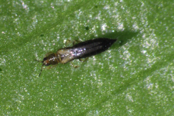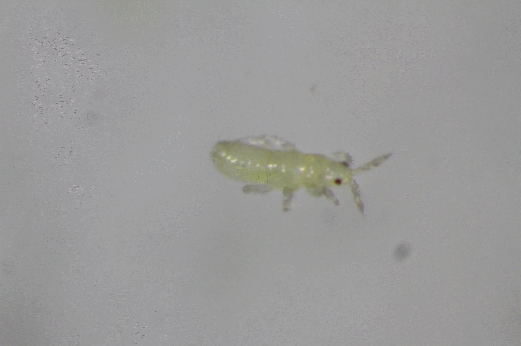Adult T. parvispinus are small, slender insects with fringed wings that are difficult to detect without magnification.