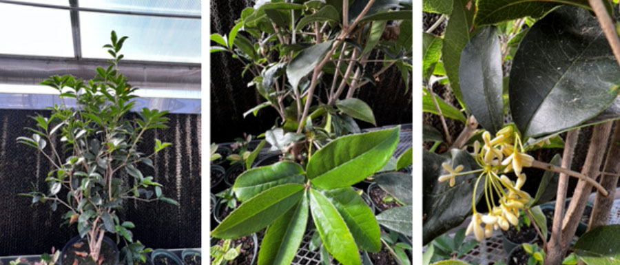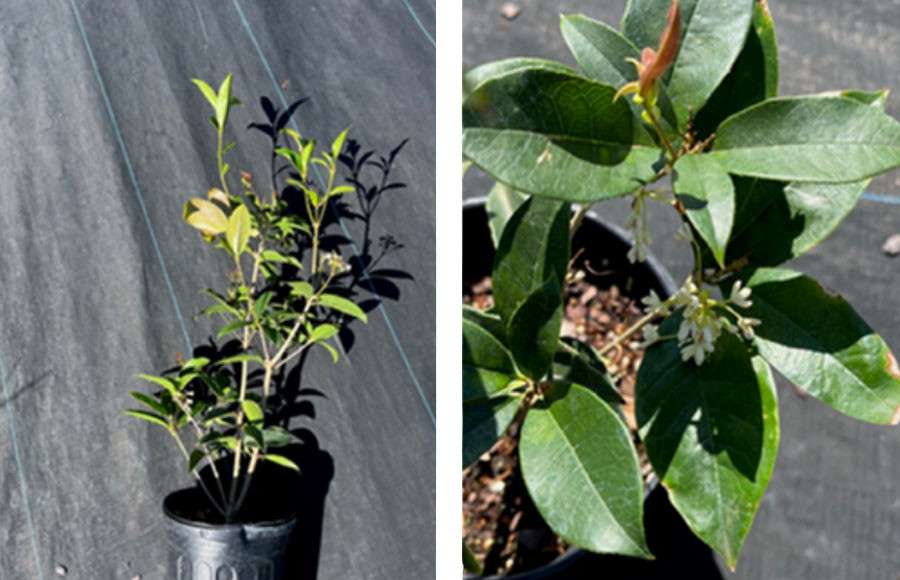 Sweet tea olives (Osmanthus fragrans Lour.) are woody, evergreen broadleaf shrubs or small trees in the Oleaceae family (He & Shang, 2017). These plants can reach heights of 25 ft but are more commonly observed at 10 to 12 ft high and can be grown in USDA hardiness zones 7b through 9b (Gilman & Watson, 2019).